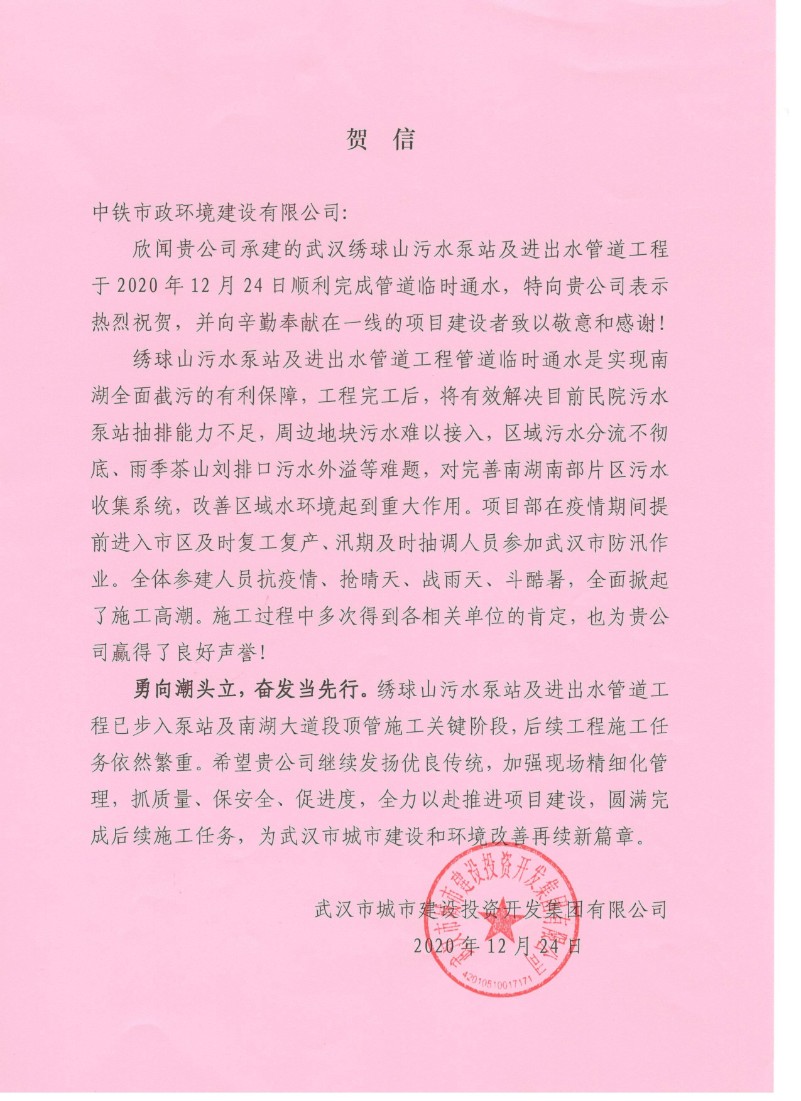 2020年12月24日,武漢繡球山污水泵站及進出水管道工程項目部順利完成管道臨時通水。自項目施工以來,全體參建人員抗疫情、搶晴天、戰雨天、斗酷暑,全面掀起施工高潮,施工過程中多次得到各相關單位的肯定。工程完工后,南湖全面截污將得到有利保障,有效解決目前民院污水泵站抽排能力不足,周邊地塊污水難以接入,區域污水分流不徹底、雨季茶山劉排口污水外溢等難題,對完善片區污水收集系統、改善區域水環境起到重大作用。為此,武漢市城市建設投資開發集團有限公司發來賀信。