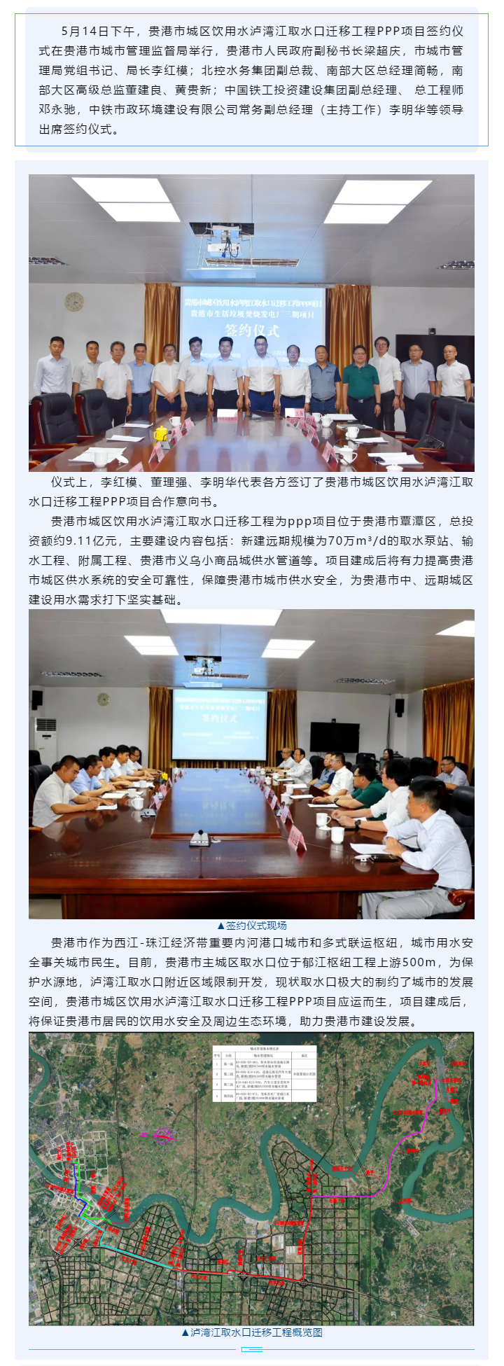 中鐵市政環境簽約貴港市城區飲用水瀘灣江取水口遷移工程PPP項目